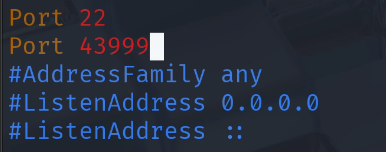 修改配置文件如下,去掉 #Port 22 的注释#,添加Port 43999,这里去掉22端口的注释是为了如果修改的
