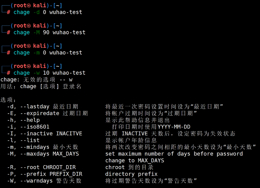 ( 1)强制用户首次登陆时修改口令,强制每90天更改一次口令,并提前10天提示: change命令