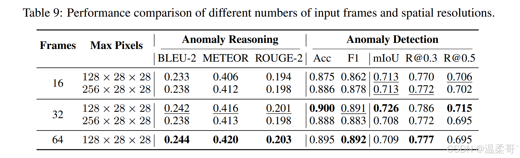 一方面,我们观察到帧数从 16 增加至 64 可在异常推理与检测两个任务上均带来性能提升,说明更多帧提供了更有用的视觉信息。