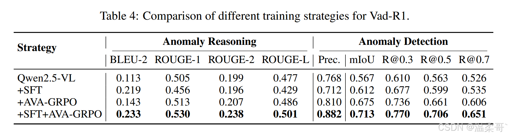 与原始 GRPO 相比,AVA-GRPO 额外引入了异常验证奖励,用于在仅有视频级弱标签的情况下激励 MLLM 提升异常推理能力。同时,我们还加入了一个长度奖励,以控制生成文本的长度。