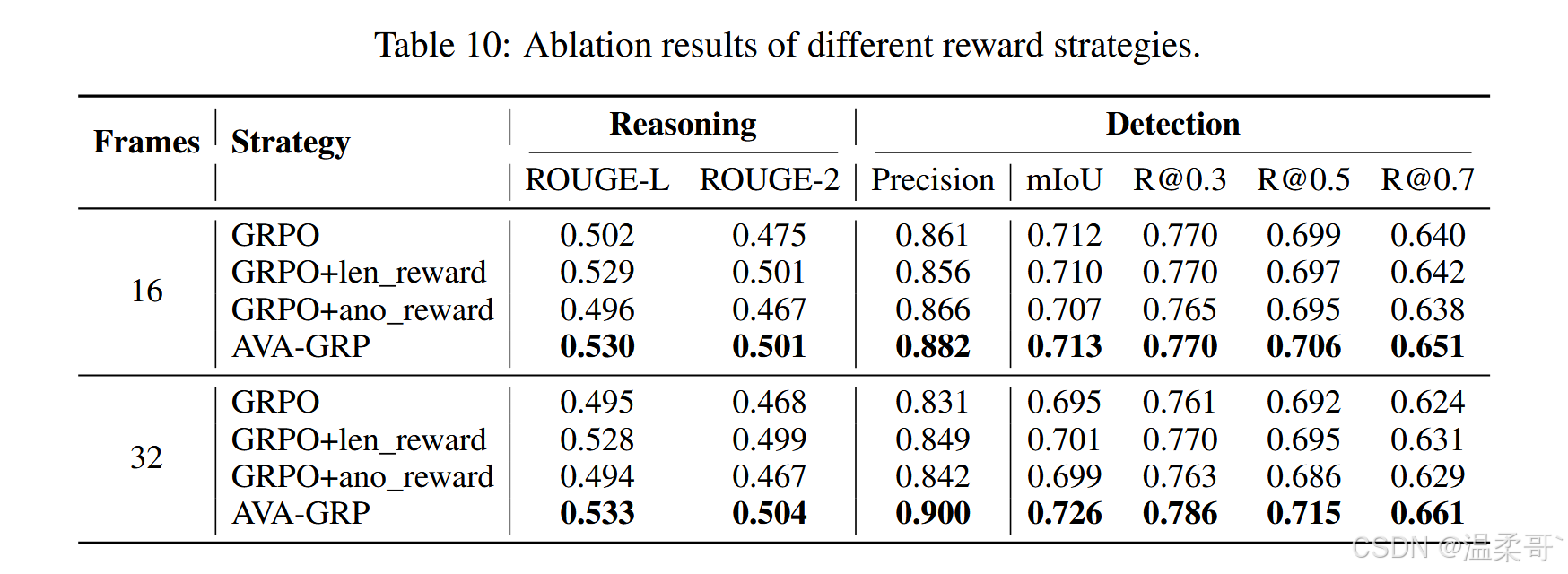 - 在 16 帧和 32 帧两种设置下,AVA-GRPO 在异常推理与检测任务中均优于原始 GRPO。