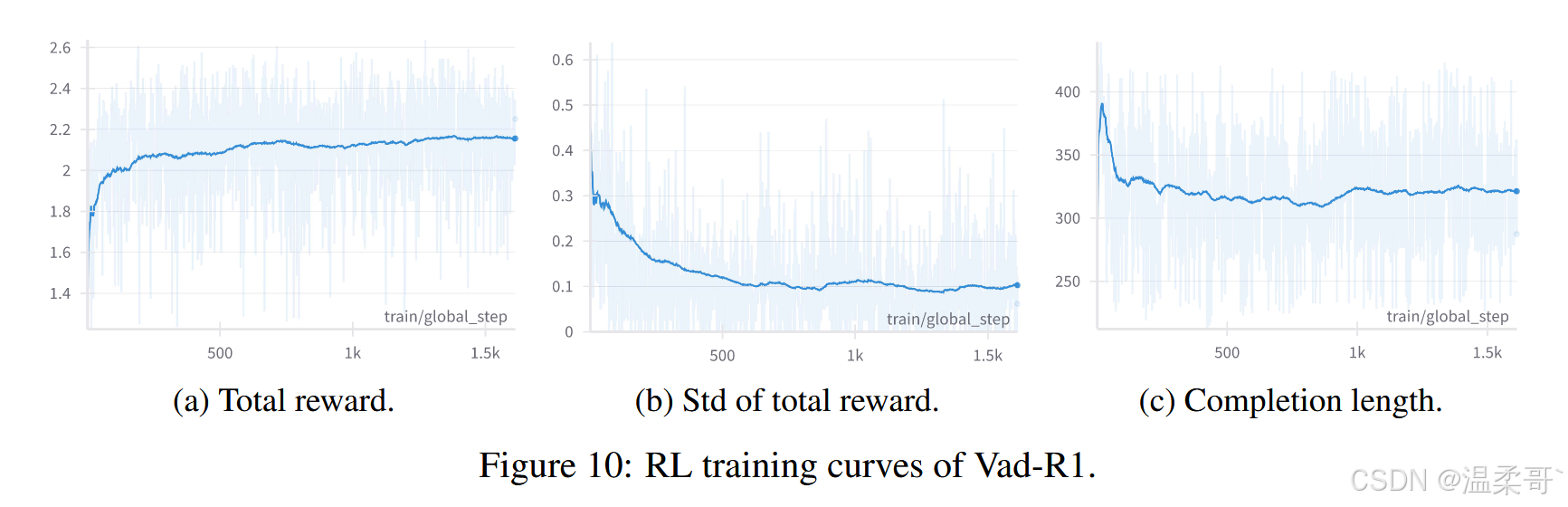 - 图 10(a) 显示了 AVA-GRPO 的总奖励随训练步骤的变化,总体趋势为稳定上升,并在约 1000 步后收敛,说明 Vad-R1 的输出策略与奖励函数的匹配程度持续提升。