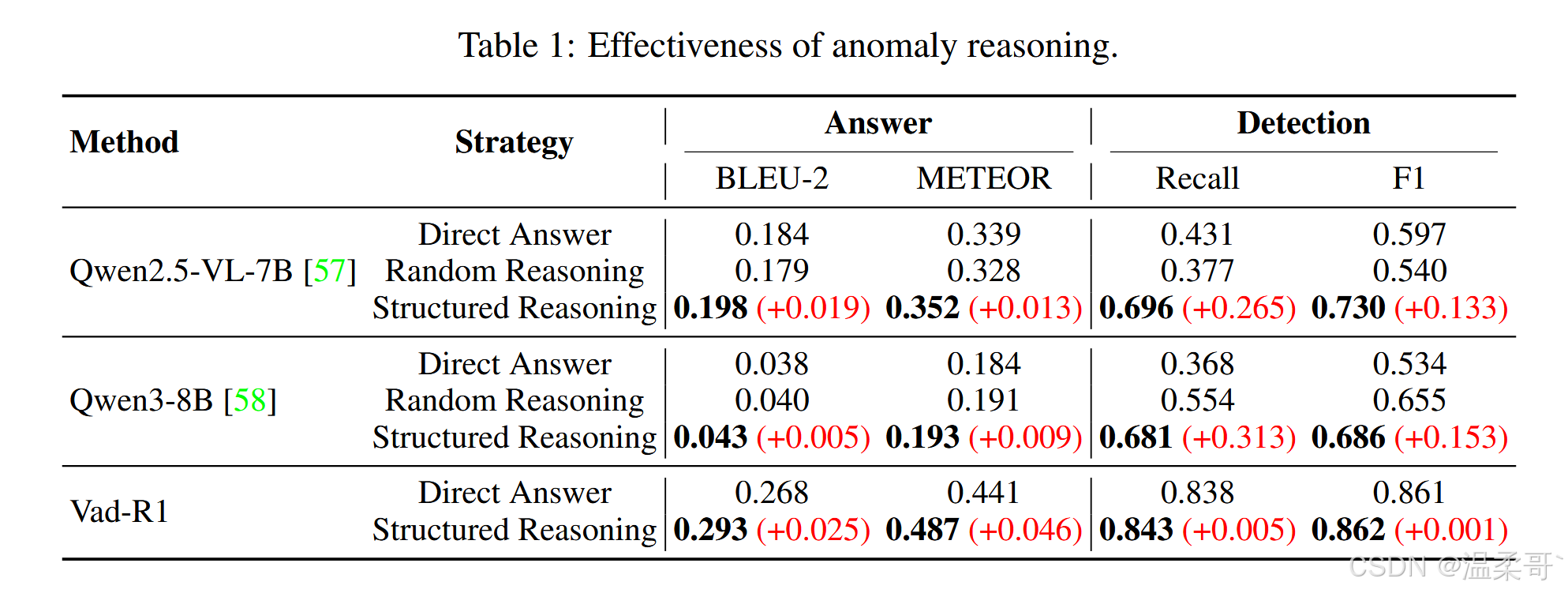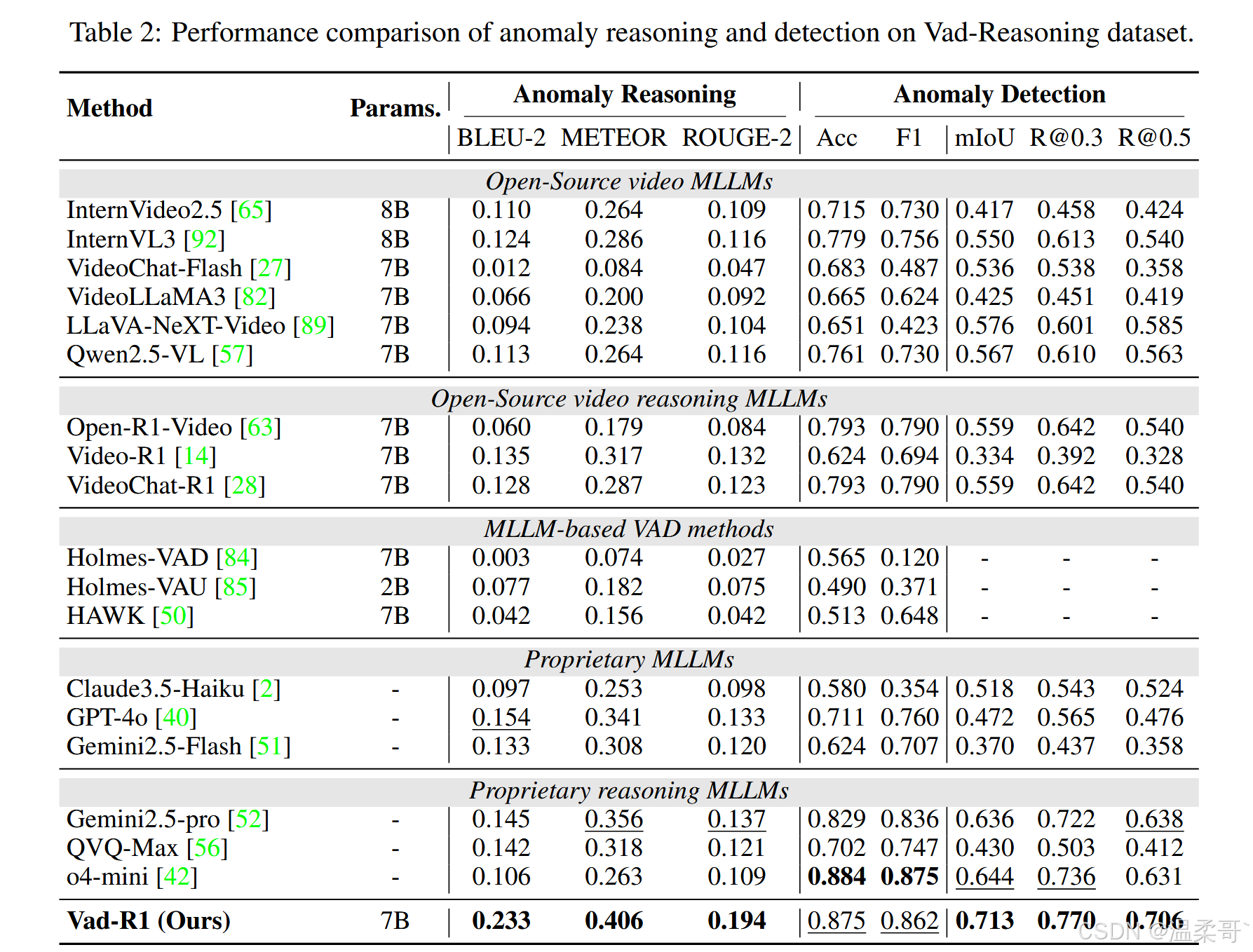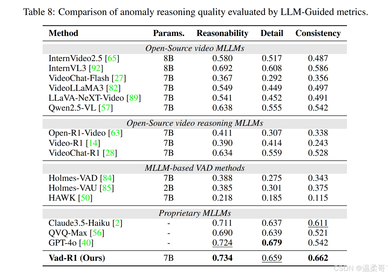 表 8 展示了在 Vad-Reasoning 测试集上的评估结果对比。结果表明: