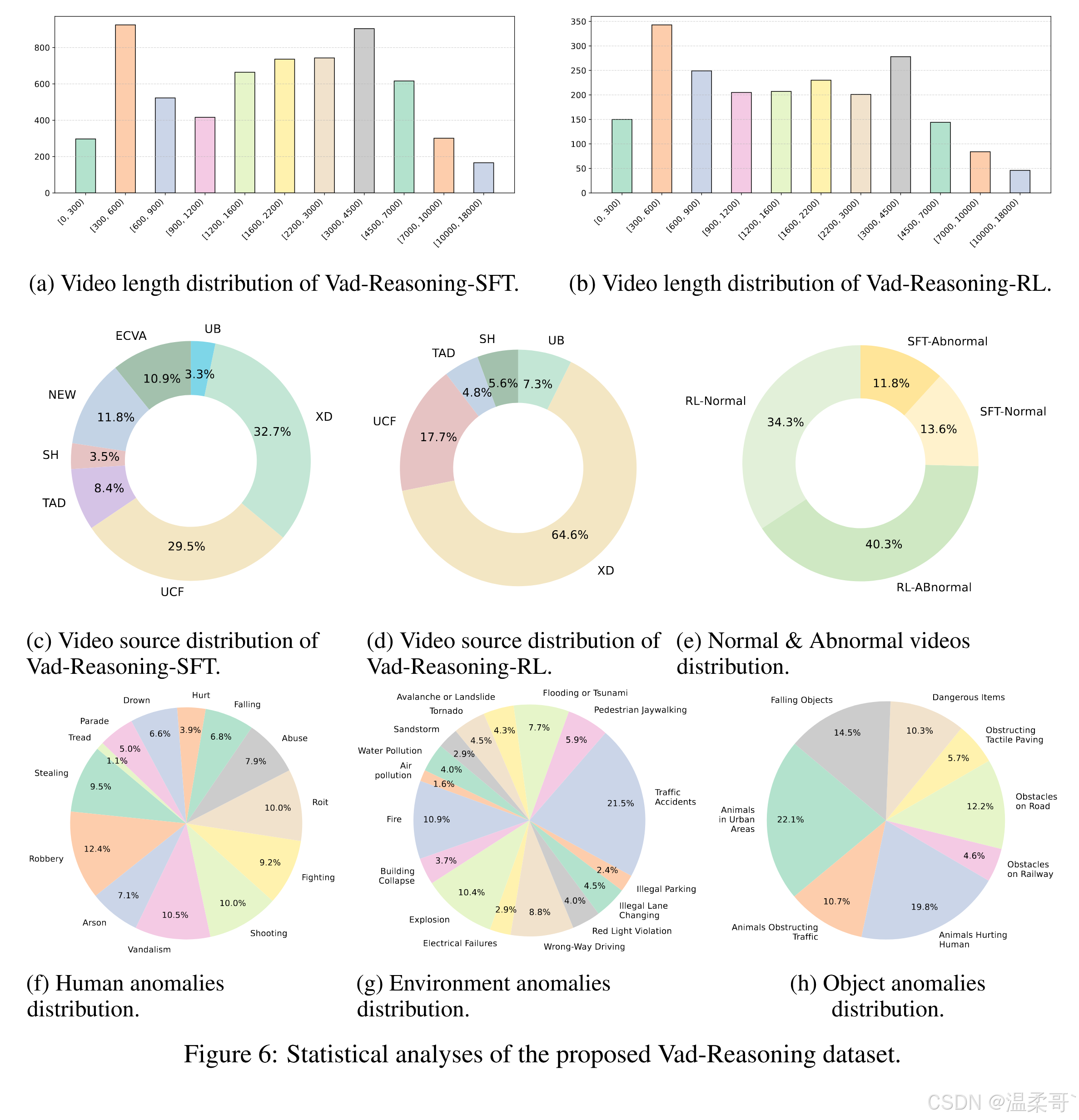 图 6 对 Vad-Reasoning 数据集进行了全面的统计分析。图 6(a) 与 6(b) 展示了视频时长的整体分布,整体分布较为均匀。图 6(c) 与 6(d) 显示,大部分视频来自 UCF-Crime [49] 与 XD-Violence [66],另有约 10% 的视频来源于互联网。