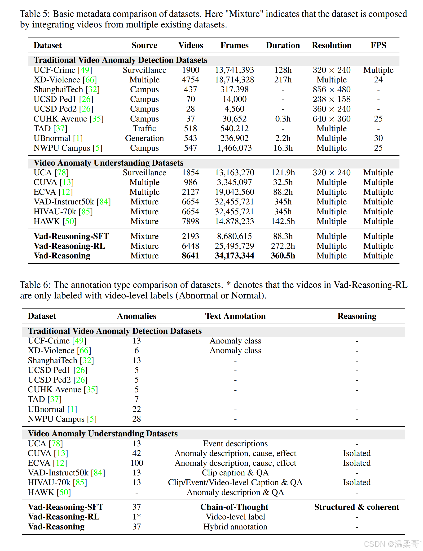 我们将 Vad-Reasoning 与现有的视频异常检测与理解数据集进行了对比,如表 5 和表 6 所示。Vad-Reasoning 总共包含 8641 个视频,涵盖 3400 万帧和超过 360 小时的视频时长,是当前最大规模的视频异常理解基准之一。
