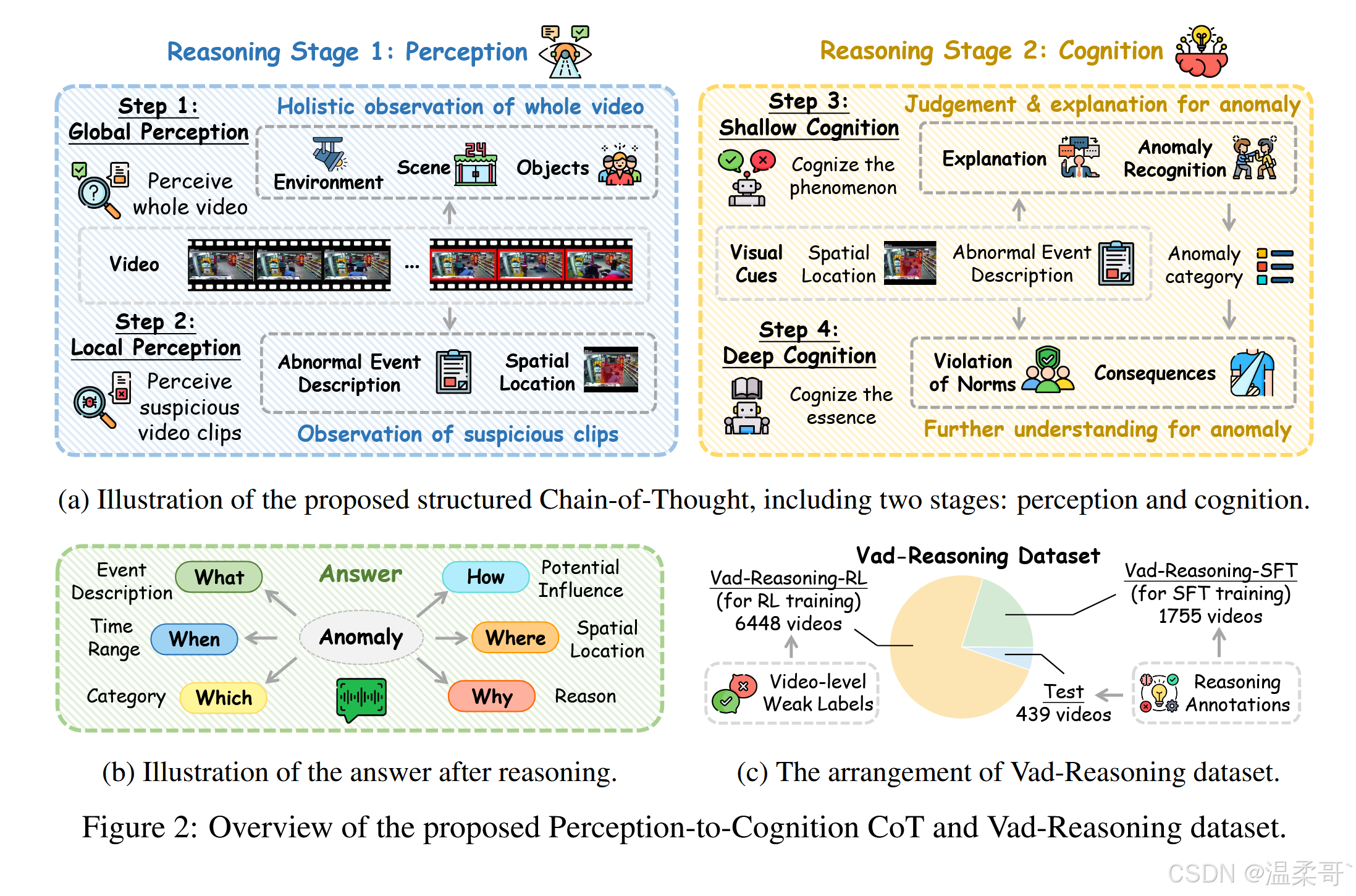 设计 Perception-to-Cognition 四步推理链(全局感知 → 局部感知 → 浅层认知 → 深层认知),构建Vad-Reasoning数据集,可同时用于监督微调与强化学习