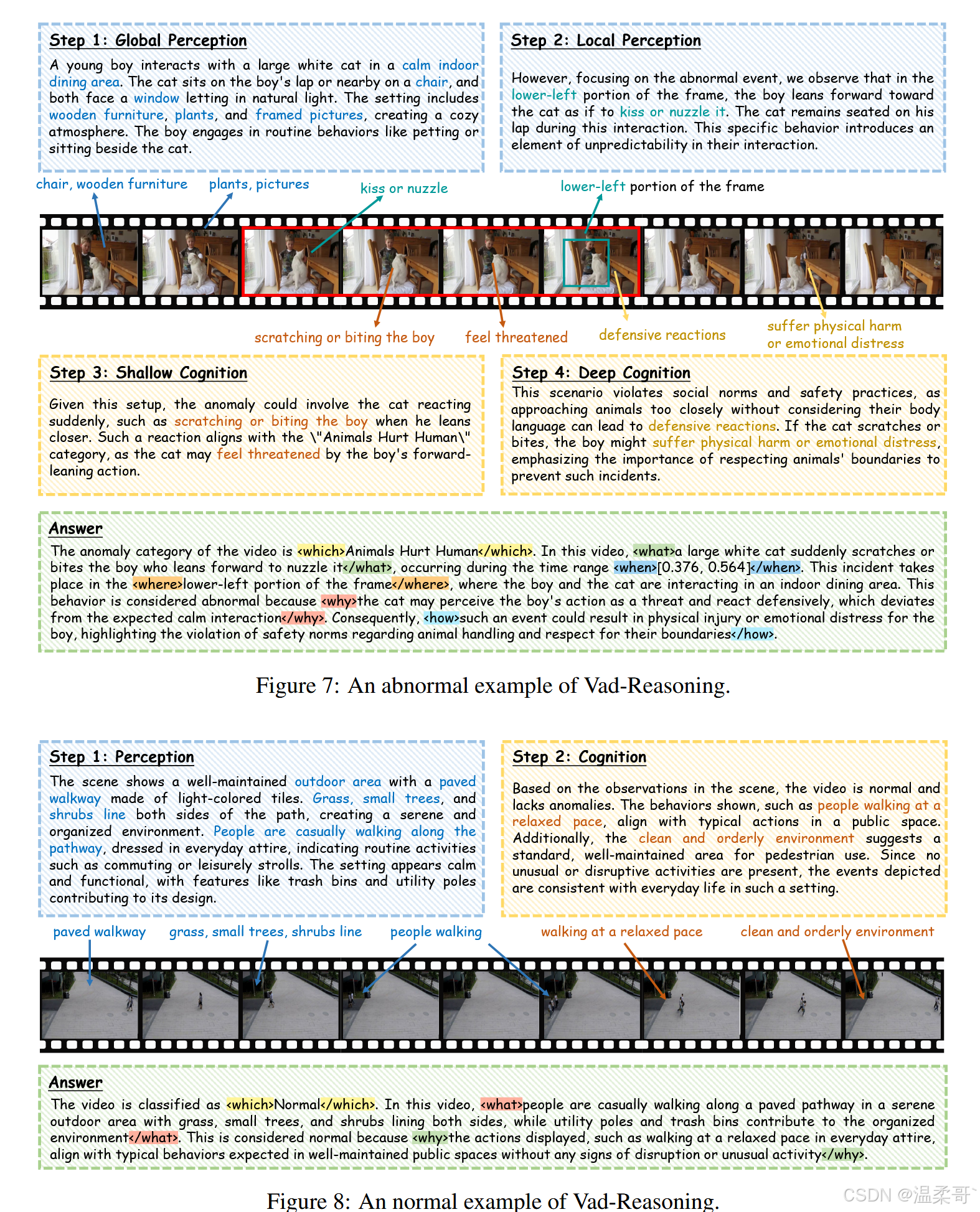 我们在图 7 和图 8 中提供了两个 Vad-Reasoning 数据集的示例。需要注意的是,对于正常视频,其 CoT(思维链)被简化为两个步骤,即感知与认知两个阶段。