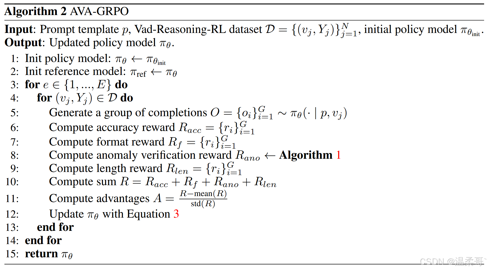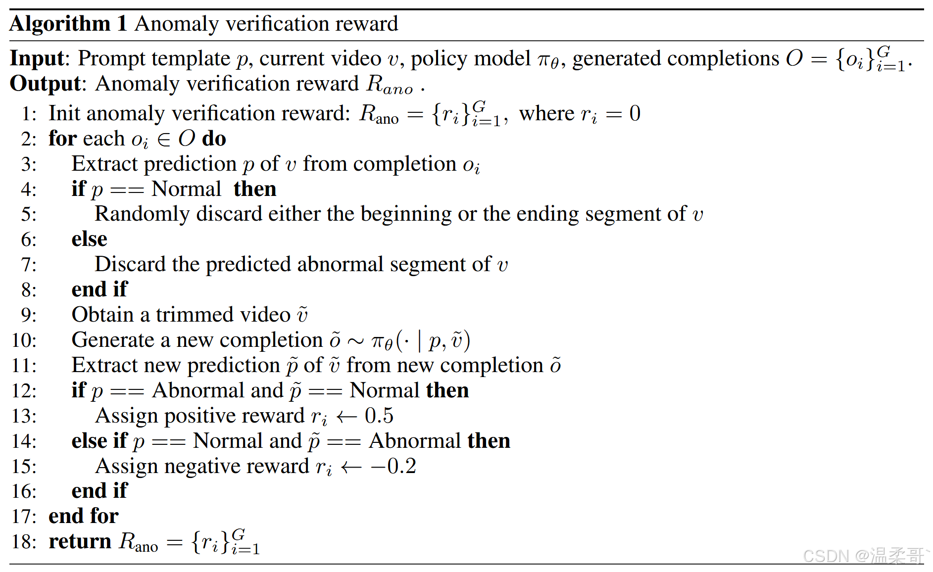 该算法是 GRPO [47] 的扩展版本,专为 VAR 任务设计。在强化学习过程中,模型首先生成一组推理结果。基于这些推理结果,对原始视频进行时间裁剪,裁剪后的视频再次输入模型以生成新的推理输出。随后,比较两组推理结果,若满足预设条件,则给予额外的异常验证奖励。AVA-GRPO 通过这种自验证机制,在仅有有限标注的情况下,有效提升 MLLM 的视频异常推理能力。