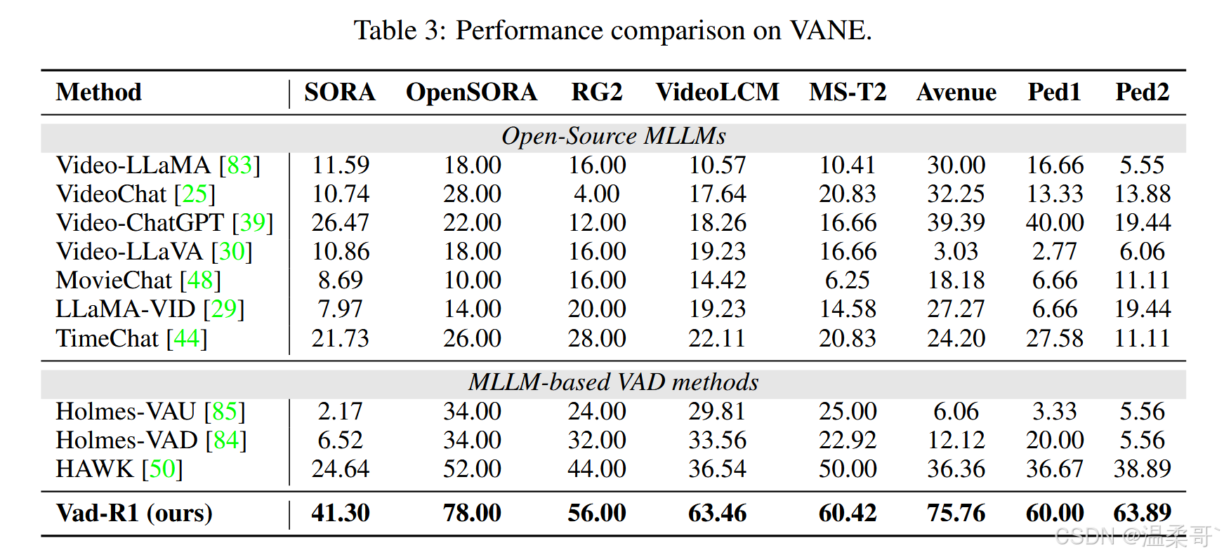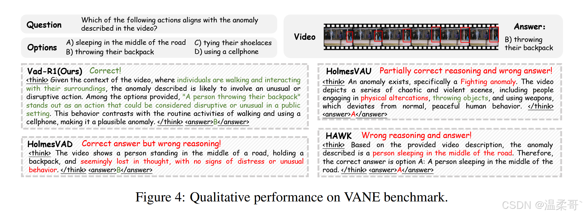需要注意的是,由于 Vad-R1 使用了包含 UCF-Crime 视频的 Vad-Reasoning 数据集进行训练,我们在 VANE 基准中排除了 UCF-Crime 对应子集以避免数据泄漏。