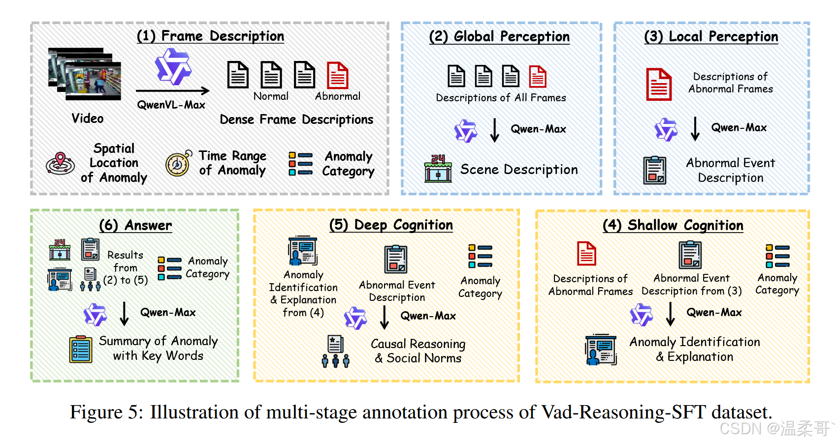 最后,Qwen-Max 将以上各阶段输出整合生成简洁摘要,并用定义好的标签包裹关键词,例如使用 表示预测的异常类型, 表示异常事件的描述等。