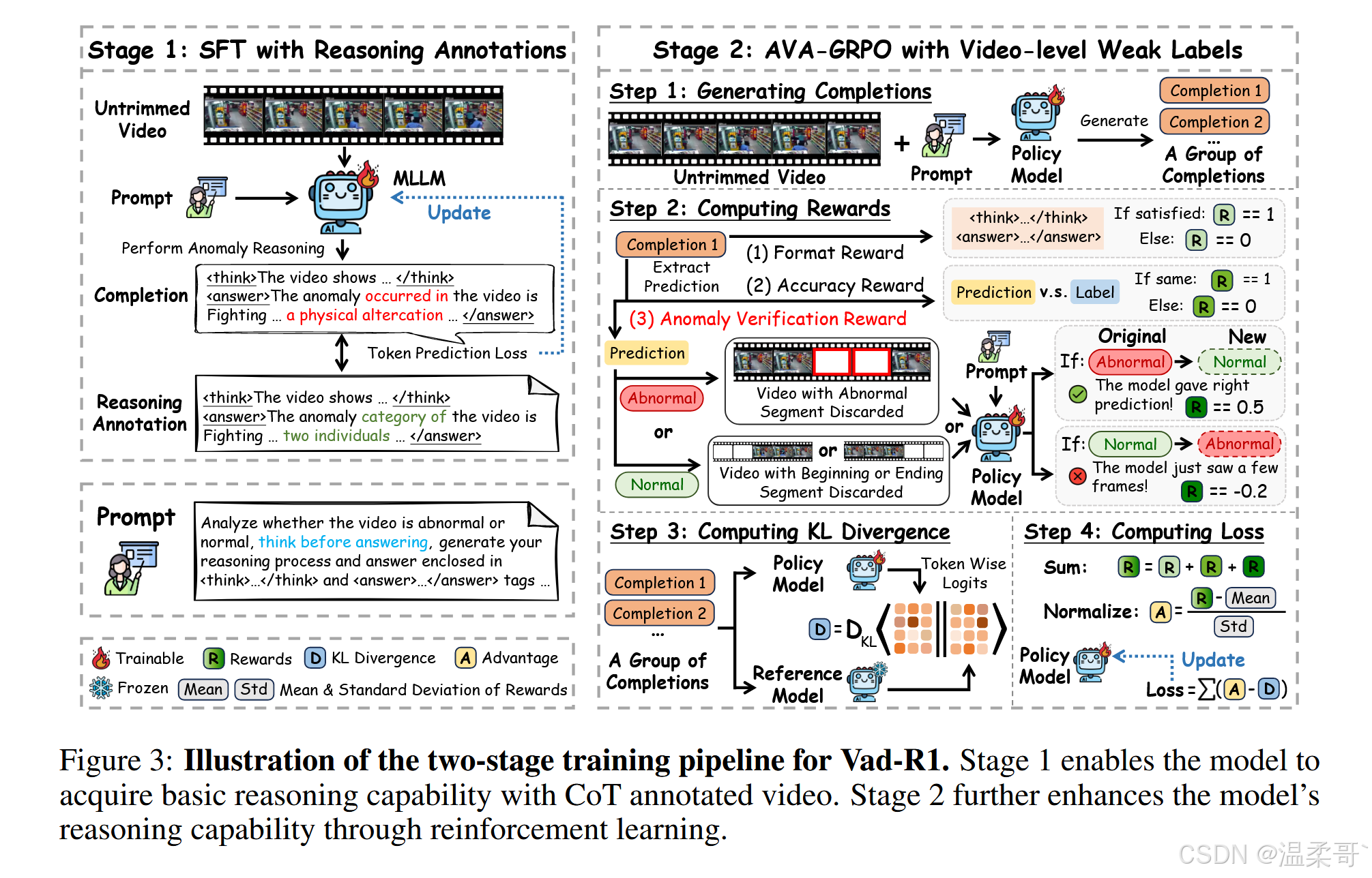 为了解决第二个挑战,受 DeepSeek-R1 成功经验的启发,我们提出了一个如图 1(c) 所示的两阶段训练流程。在第一阶段,通过监督微调(Supervised Fine-Tuning, SFT)使基础 MLLM 具备基本的异常推理能力;在第二阶段,使用我们提出的 AVA-GRPO(Anomaly Verification Augmented Group Relative Policy Optimization)强化学习算法进一步激励模型的推理能力。