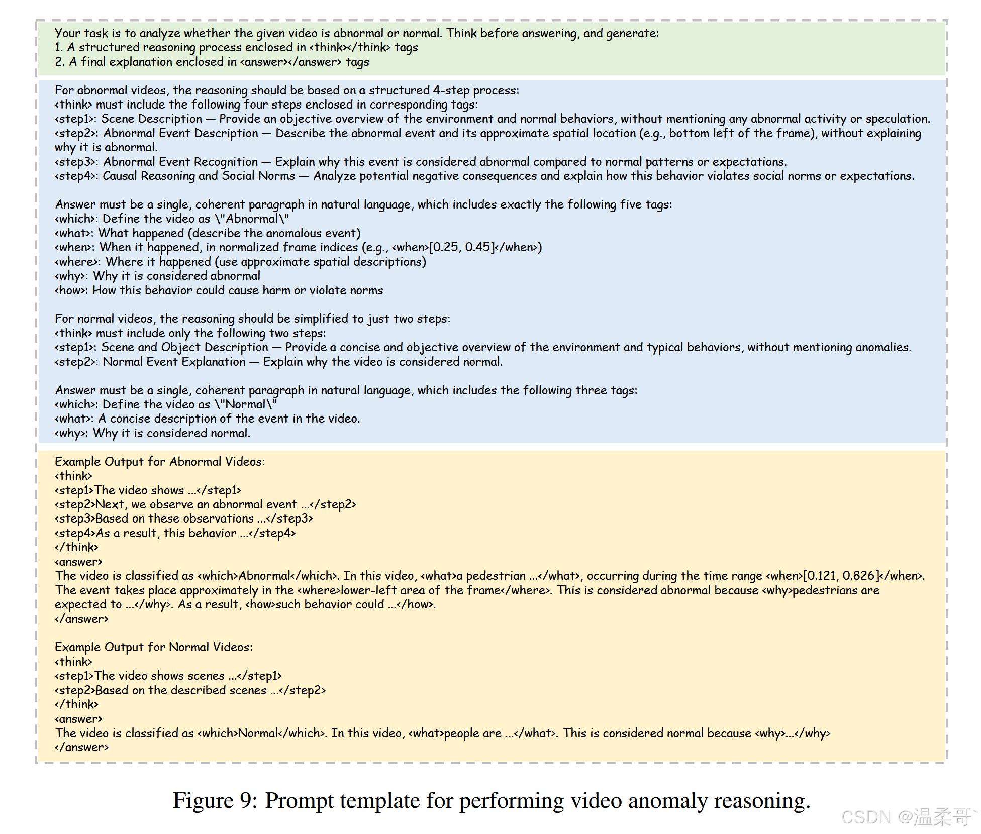 用于执行视频异常推理的提示如图 9 所示。该提示由三部分组成:任务定义(Task Definition)、输出规范(Output Specification) 和 格式要求(Format Requirements)。