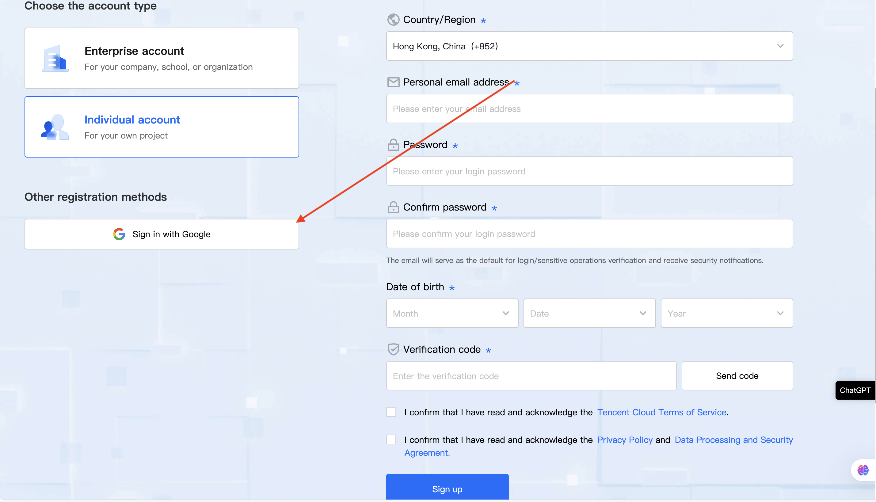• 进入[腾讯云国际版官网](https://intl.cloud.tencent.com),点击右上角「Sign Up」。