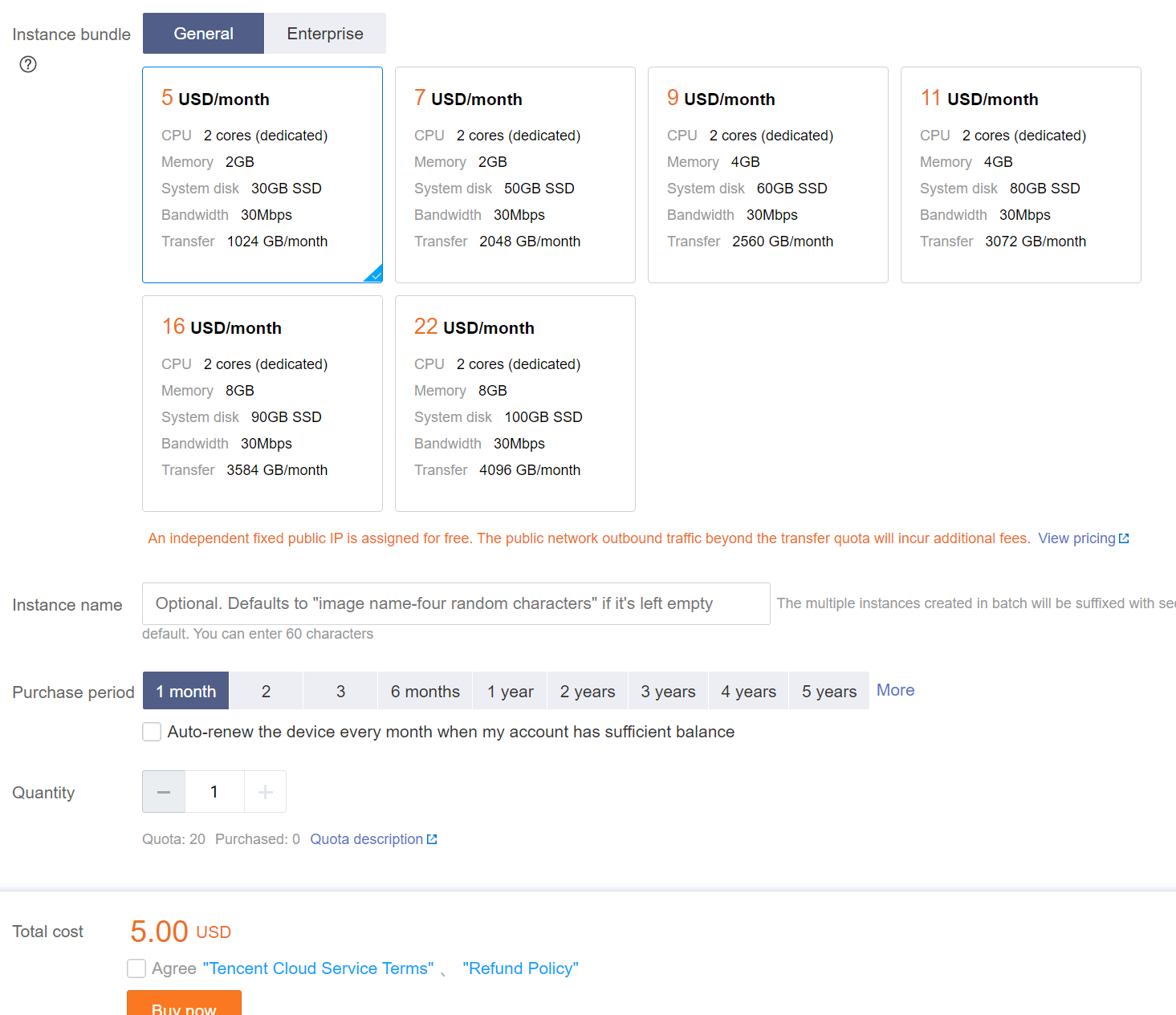 控制台路径:CVM → Create Instance → Asia Pacific → Hong Kong → Standard S5 → Ubuntu 22.04 → 分配公网IP → 绑定密钥对 → 启动实例