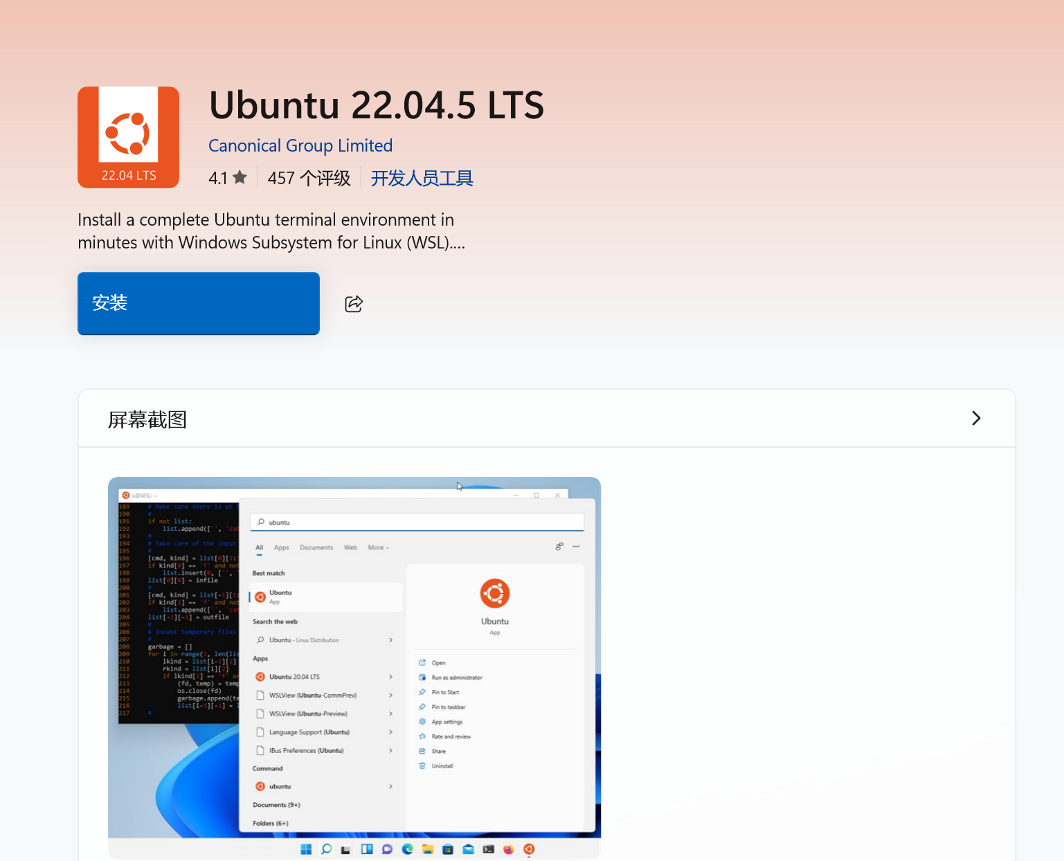 下面开始ubuntu的安装,打开微软商城找到Ubuntu22.04,点击安装。