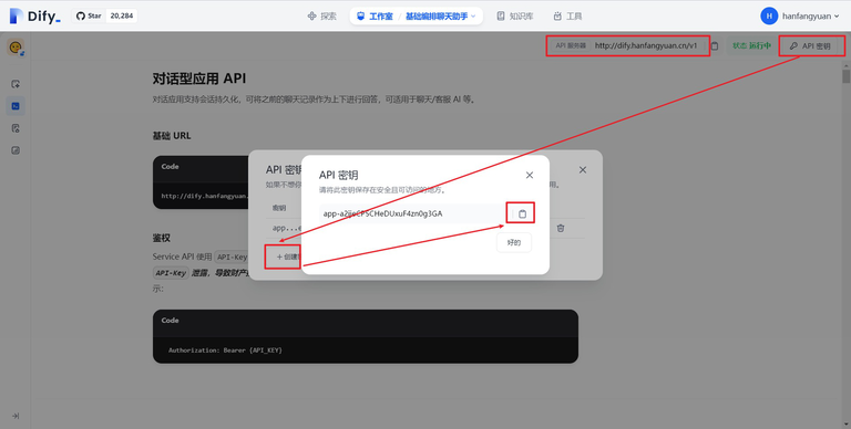 至此,创建聊天助手的准备工作结束,在此小节中我们只需要保存好两个东西:API密钥与API服务器地址