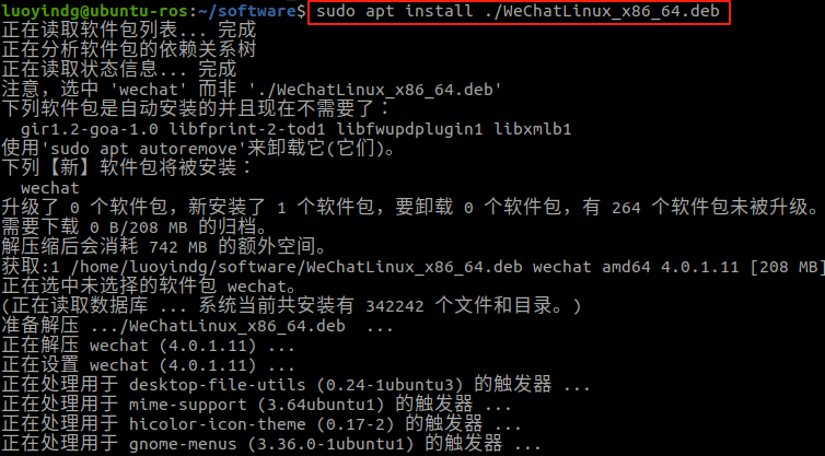 下载好安装包后,在保存WeChatLinux_x86_64.deb包的文件夹中,右键鼠标选择“在终端打开”,在终端中输入命令:sudo apt install ./WeChatLinux_x86_64.deb