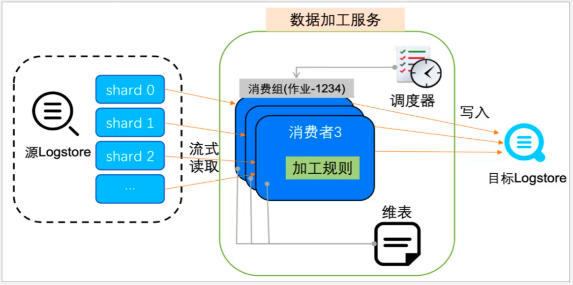 提供数据加工:规整、富化、流转、脱敏和过滤。调度机制:每一个日志通过加工规则处理后再输出到日志库;对每个加工规则都会启动一个或者多个加工服务调度器运行实例,每个实例扮演消费者角色去消费1个或多个shard,消费的时候根据CPU资源决定并行情况,最多启动和shard相同的数量并行。任务停止机制:如果用户没有配置结束就不会结束一直加工,配置了停止就会停,任务停止后再次启动默认保存上次消费位置继续。