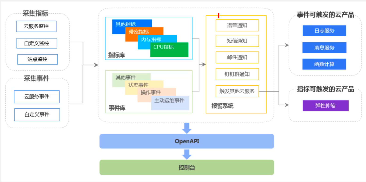 可以通过云监控控制台、云产品自身的控制台(不支持告警设置)、API;