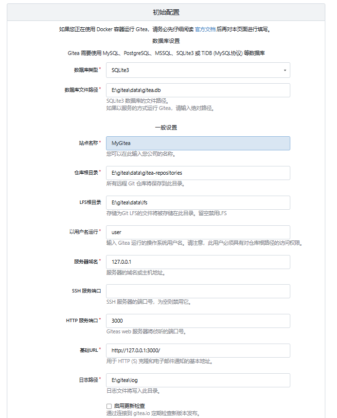 注意,如果你的git的版本很老,这一步可能出错,原因是 gitea 调用 ssh-keygen时候,路径名里的"“转义符的问题,让路径里的”"破坏了key的全路径。此时,只要根据data文件夹里多出来的奇怪长文件名“egitea?ata?sh?itea.rsa”,手工恢复到指定文件夹“E:giteadatassh”里即可。