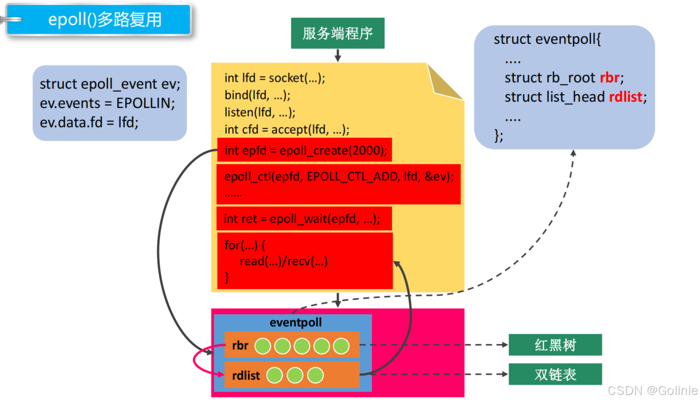 调用epoll_wait之后内核就会去检测rbr里面的文件描述符是否有对应的数据改变。如果有改变的(就绪的),就会把文件描述符的信息放到rdlist中,然后会把这个list拷贝到用户区,这样用户区直接遍历这几个fd,就可以进行对应的读写操作了。