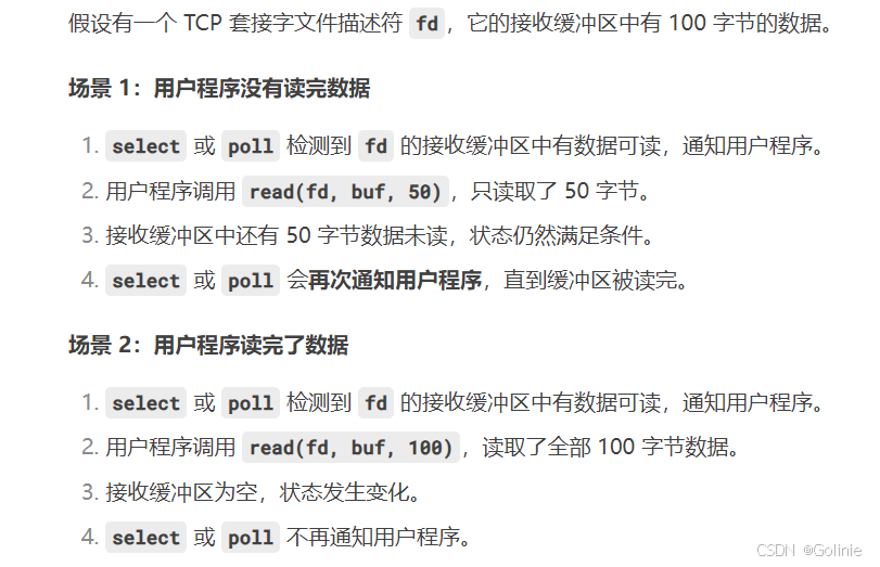 在 事件触发模式方面,select 和 poll 只支持水平触发(Level-Triggered,LT)模式:如果文件描述符的状态满足条件(例如有数据可读),select 和 poll 会一直通知用户程序,直到状态发生变化。