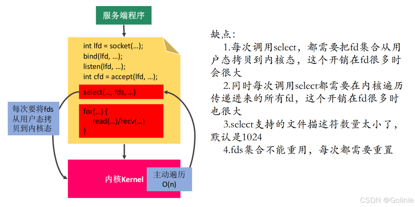 在 用户态和内核态的数据拷贝方面,每次调用 select 或 poll 时,都需要将文件描述符集合从用户态拷贝到内核态:当文件描述符数量很大时,这种拷贝操作会带来较大的开销。