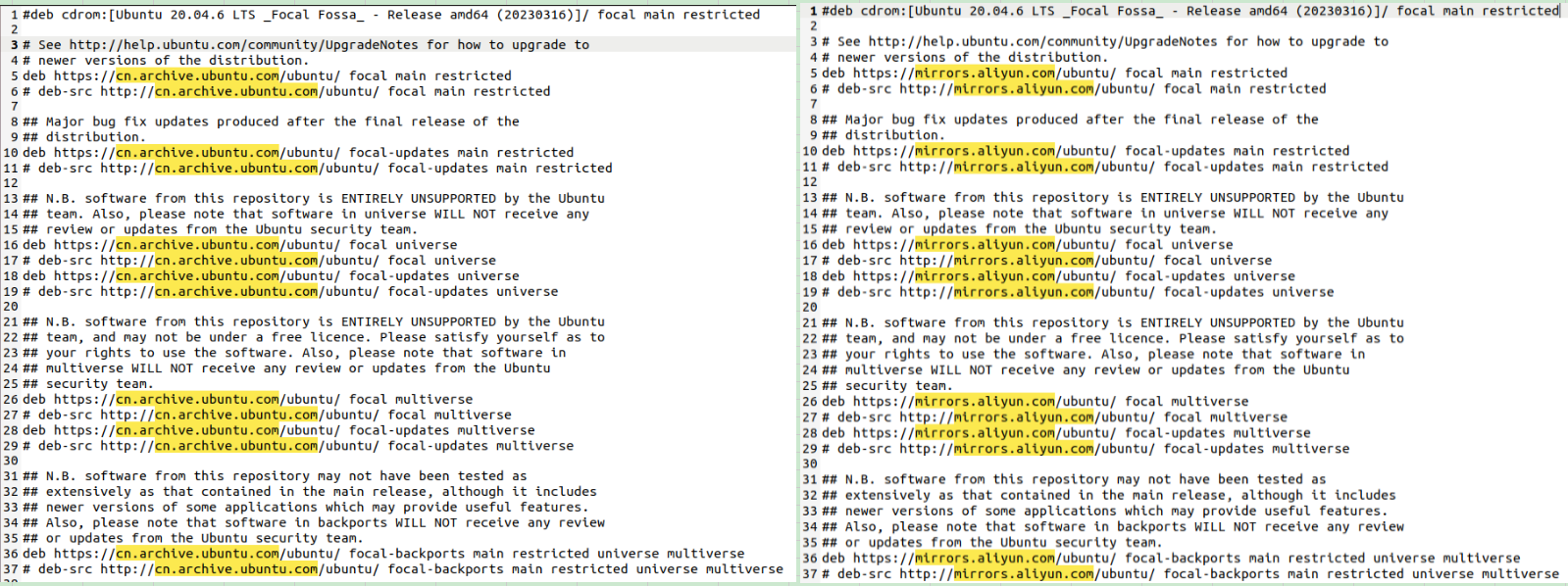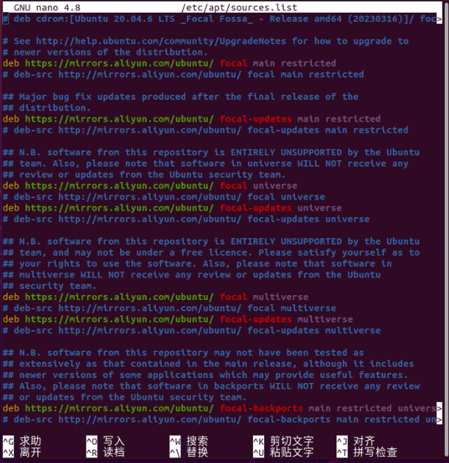 •  备注:文件中mirrors.aliyun.com 替换前是 cn.archive.ubuntu.com 后面有解释为什么。