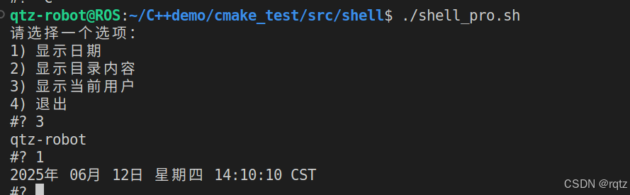 select choice in "显示日期" "显示目录内容" "显示当前用户" "退出"