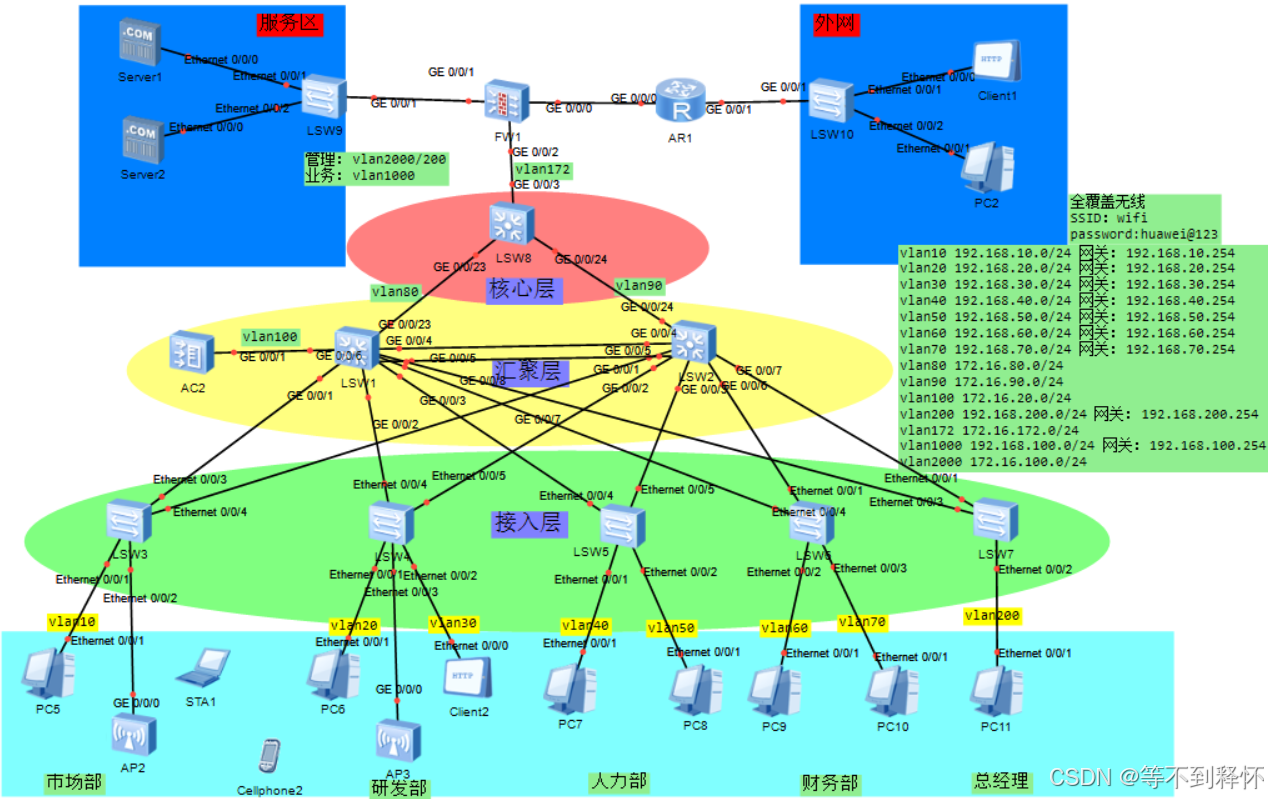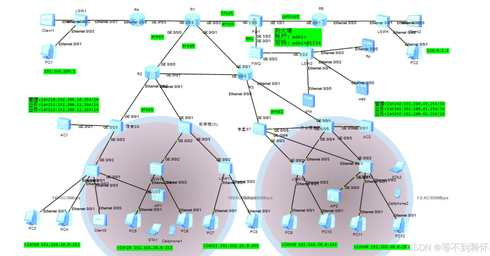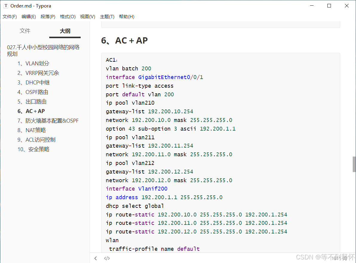 该网络运用到的技术主要有vlan划分、MSTP、VRRP、DHCP、OSPF、AC+AP、ACL和NAT等技术。非常适合适用于校园、企业、园区网络的小伙伴使用,还可适用于毕设,课设,园区网络的实现等等场景!