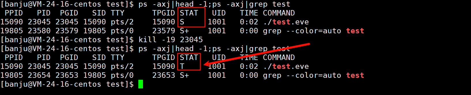 T(stopped)和t(tracing stop)两个都表示暂停状态,只不过暂停的原因是不一样的。此处将其看作一样的。