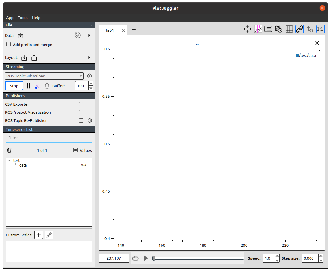 此时回到Plotjuggler界面右侧仍然是空白的,但是左下角Timeseries List中有一个test,点开后有data,拖动data至右侧曲线框内,显示曲线,数值为0.5,并且横坐标在滚动。此时读者可自行调整Buffer大小查看右侧数据滚动速度。