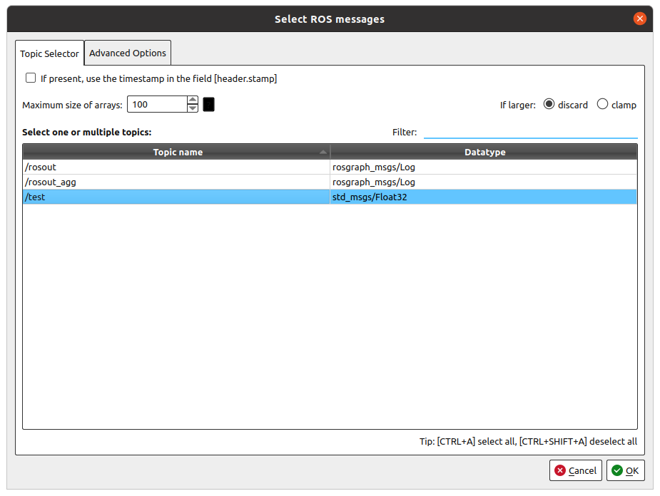 此时Select ROS messages界面出现一个话题名称为/test的消息,选择这个消息,并点击右下角的OK按钮。