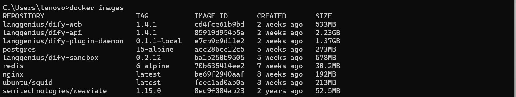 笔者的电脑上只用docker部署过dify,所以这些镜像全都与dify相关。缺一项都不可(因为笔者目的同本文标题一样,在CentOS 7 Linux系统部署dify,所以一开始自以为上图中的ubuntu/squid镜像 与在CentOS 7 Linux系统部署dify无关,所以没有导入到服务器,然后发现不行。所以以上镜像都要导入,如何导入下文会详细介绍。)