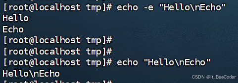 上文介绍了转义字符,要使得转义字符生效,则要在echo后加-e选项。以下是两种用法的对比: