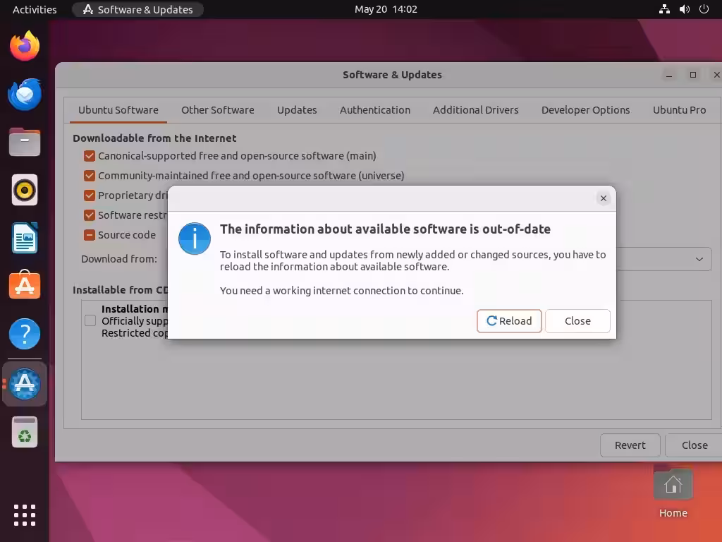 对软件源进行任何更改后,单击“关闭”,然后单击“重新加载”以更新软件存储库。