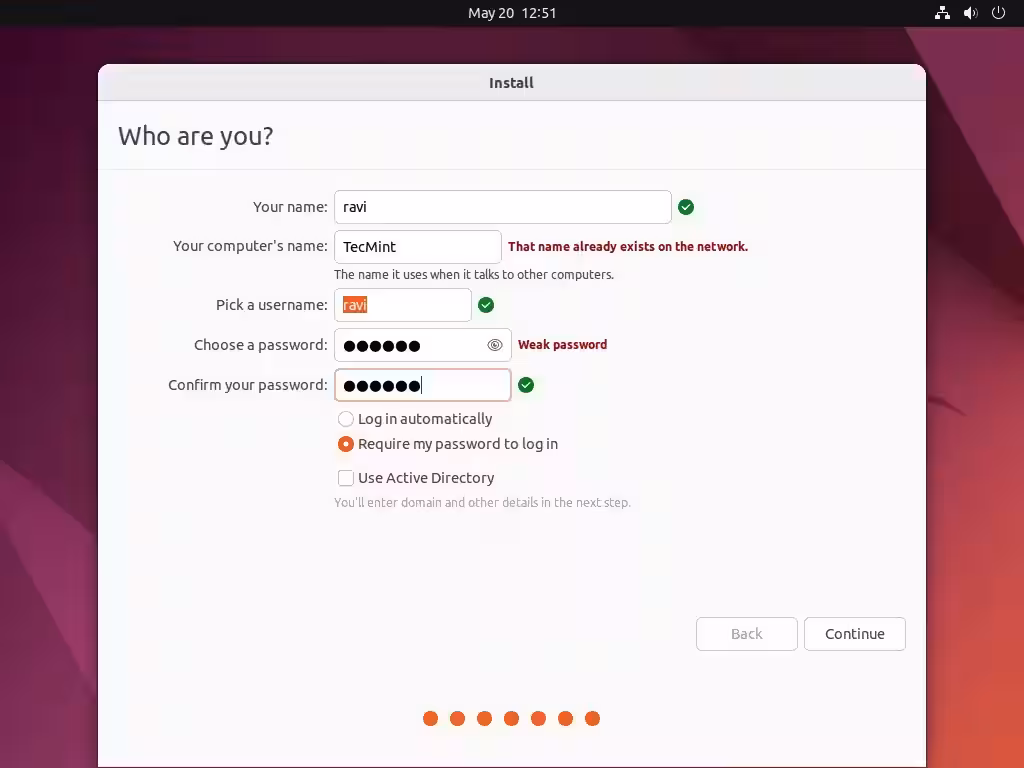 9. 接下来,输入您的姓名、所需的用户名、密码和计算机名称,为 Ubuntu 创建一个用户帐户。