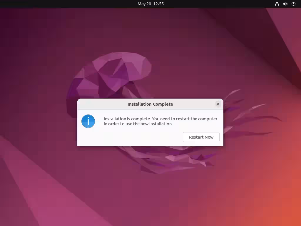 安装程序完成他的工作后,单击 Restart Now 提示符,几秒钟后按 Enter 键以重新启动系统。