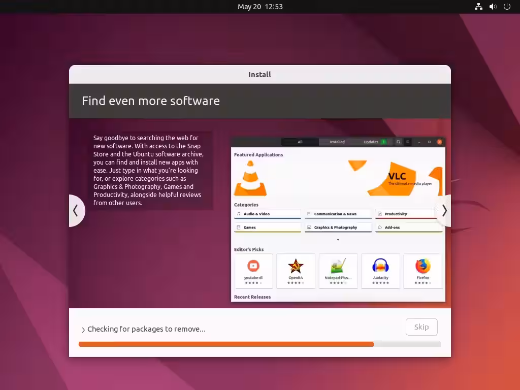 安装程序现在开始将系统文件复制到您的硬盘驱动器,同时向您提供有关全新的 Ubuntu LTS for 5 年支持系统的一些信息。