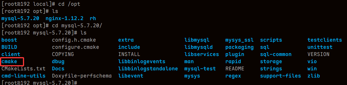 进入我们刚才解压的opt目录下,进入mysql-5.7.20目录,使用ls命令可以看到目录下有一个cmake文件