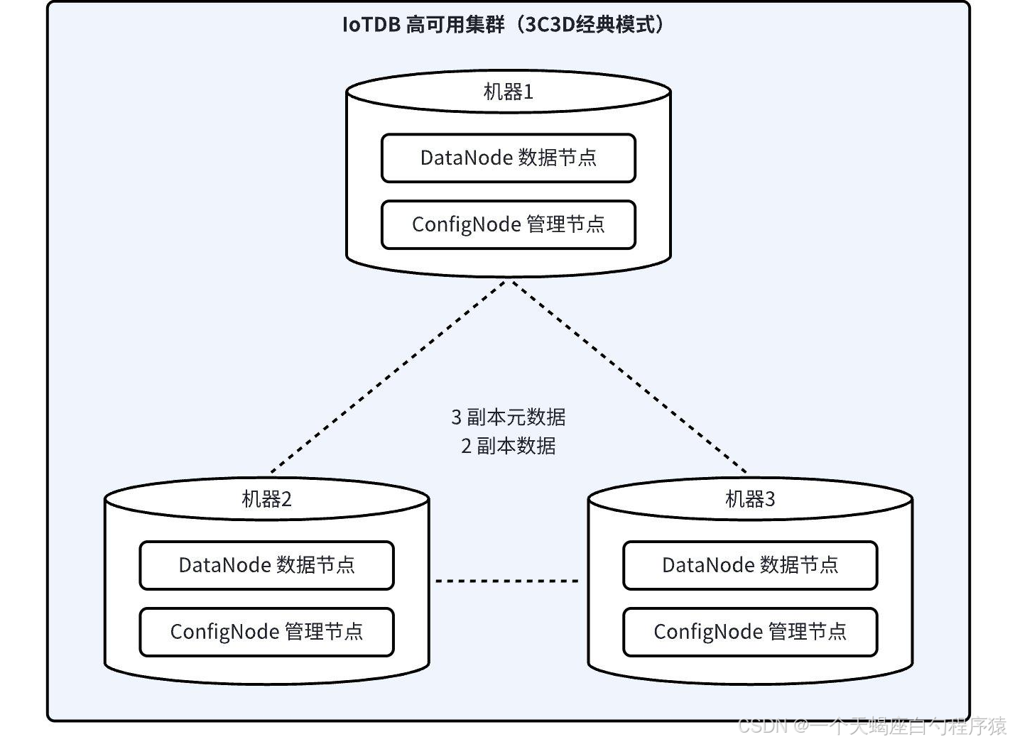 博主以IoTDB经典集群部署架构3C3D(3个ConfigNode和3个DataNode)为案例,即通常所说的3C3D集群。架构图如下: