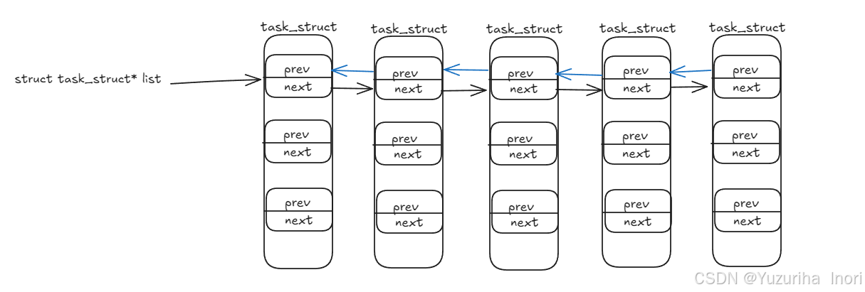 prev/list - &((struct task_struct*)0) -> links
