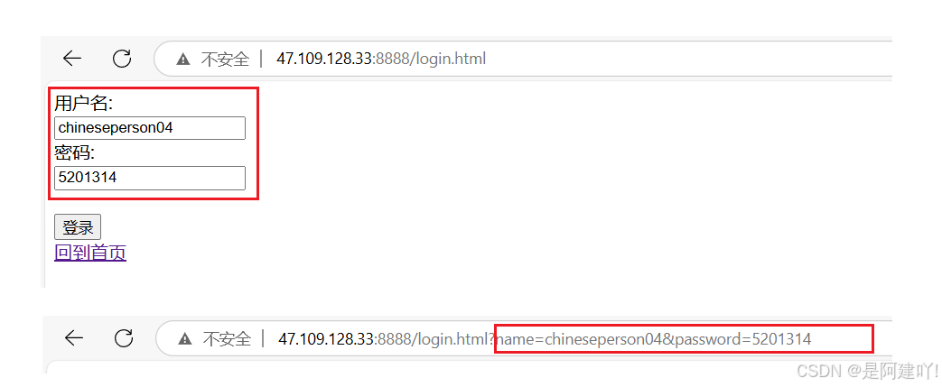 下面我实现了一个简单的登录页面,当我输入了用户名和密码后,再点击提交,发现我提交的信息作为了参数被拼接到了URL中。