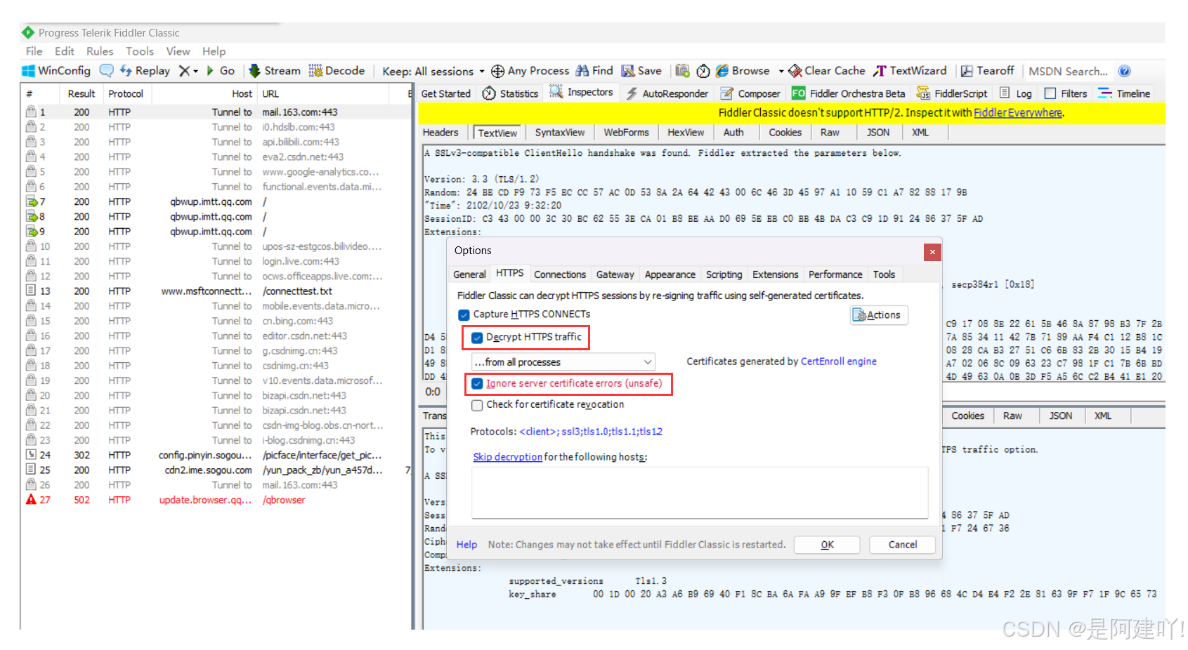 这里我们使用软件 Fiddler 进行抓包,刚刚安装的软件无法对HTTPS进行抓包,如果需要对HTTPS进行抓包,需要进行以下操作。