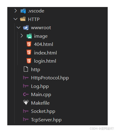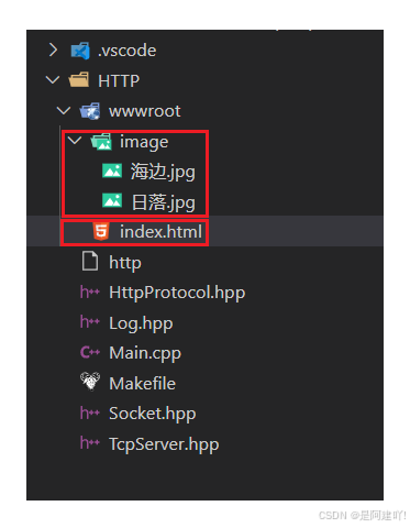 就如下图中,我这个简易的HTTP服务器中,就将主页和图片资源都放在了wwwroot这个目录下。web根目录是web服务器存储网站文件的顶级目录,由于HTTP服务器是web服务器的子集,所以我这里的wwwroot目录就可以被当做web根目录。