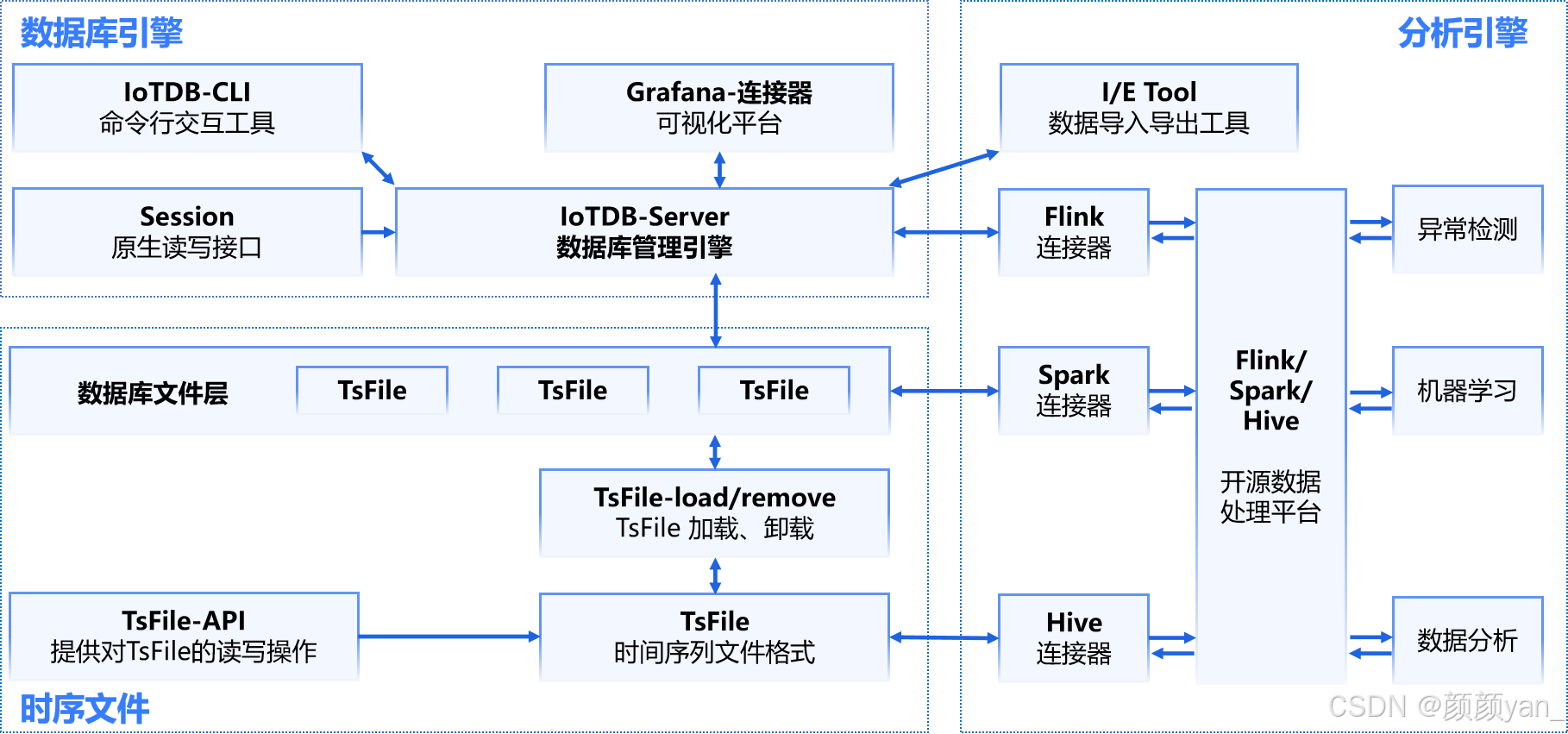 Apache IoTDB采用了创新的技术架构,专门针对物联网时序数据的特点进行深度优化。IoTDB套件由多个核心组件协同工作,构建了从数据收集→数据写入→数据存储→数据查询→数据可视化→数据分析的完整数据处理链路。