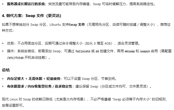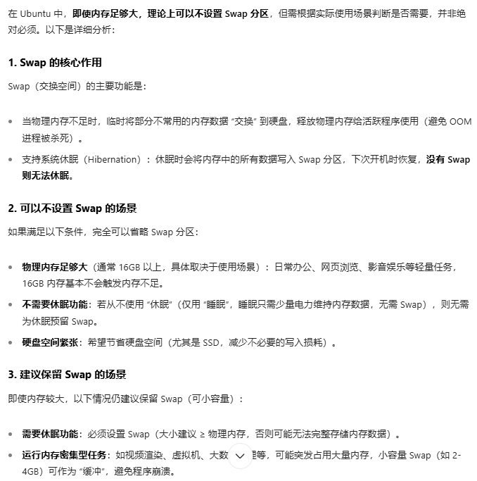 - 现代趋势:对于内存充足的系统(如 ≥ 16GB),Swap 分区可适当缩小甚至省略,但需通过