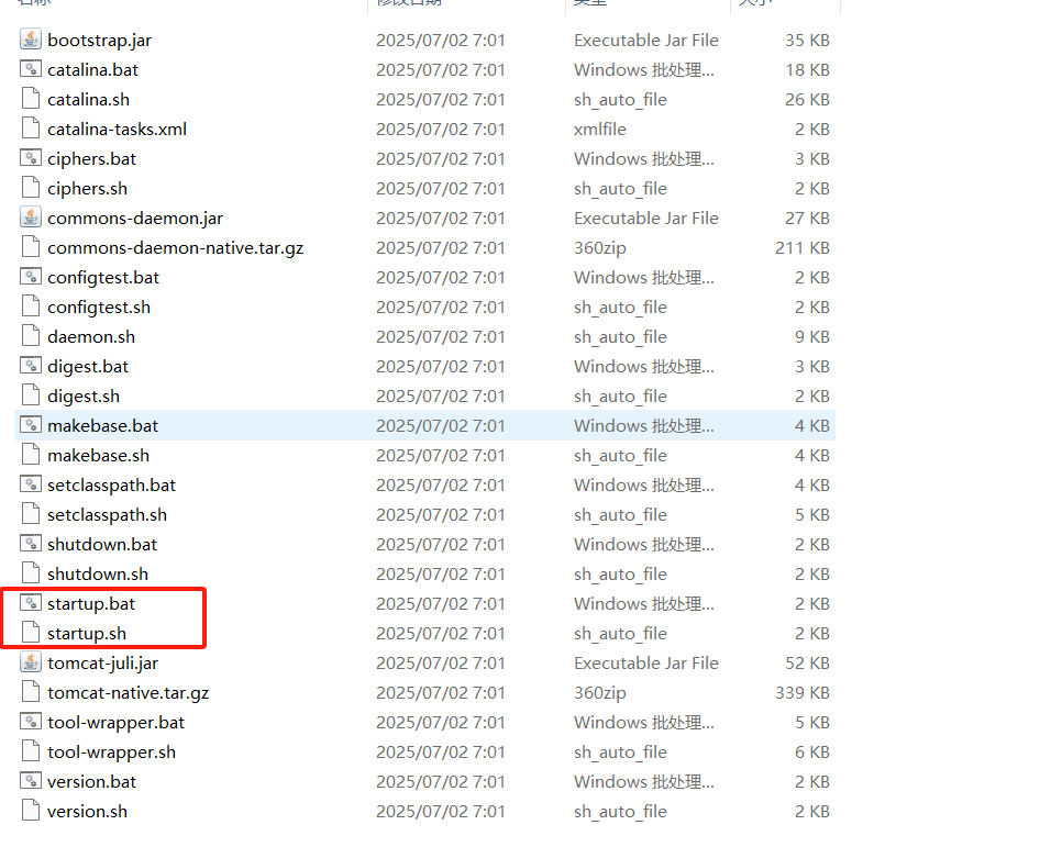 🍕🍕🍕我们注意到bin目录下的两个文件,一个是bat后缀,一个是sh后缀,Windows系统是用bat文件启动的,Linux和MAC系统是用sh文件启动,这就是展示文件后缀名的重要性