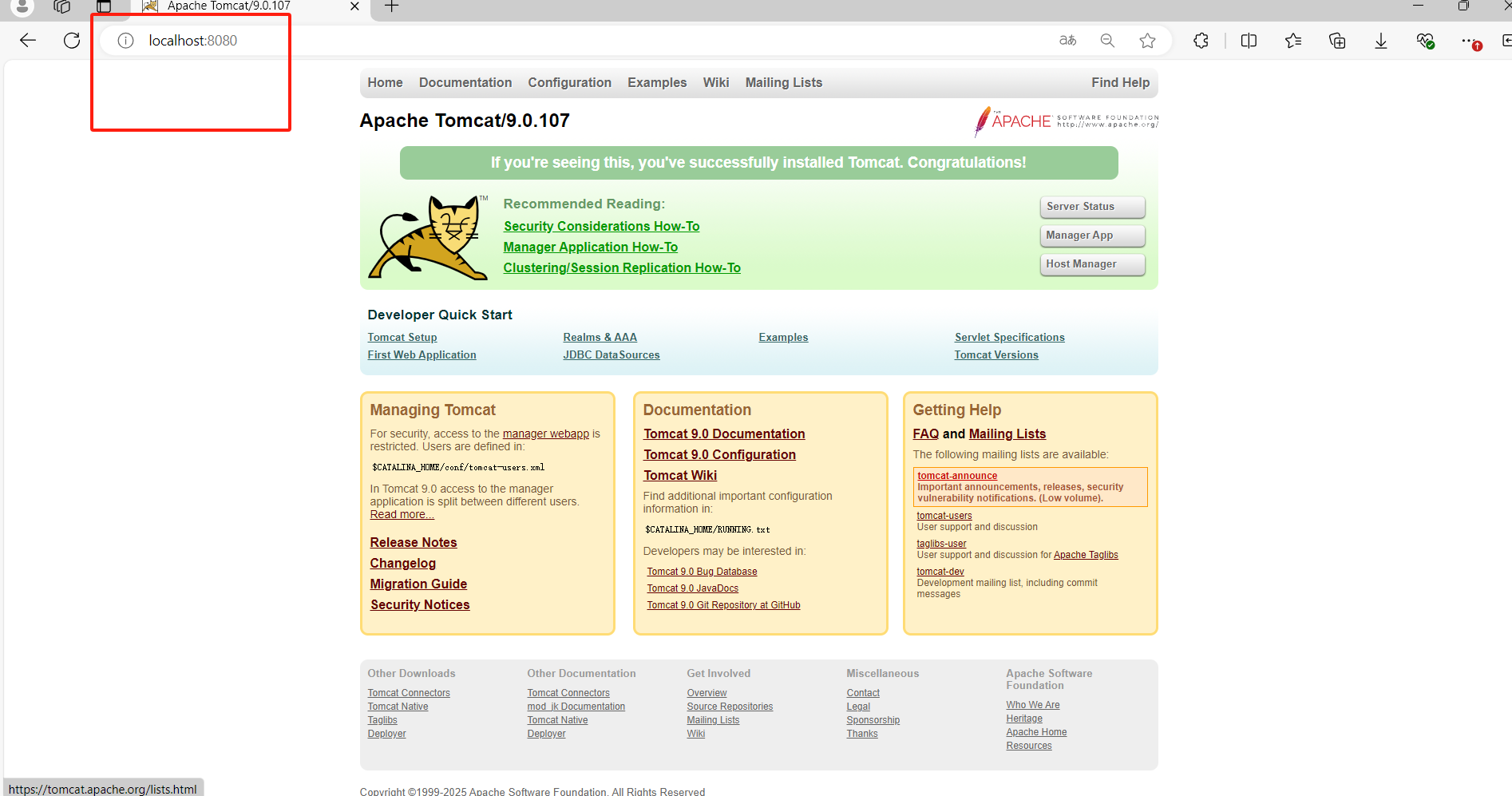🍕🍕🍕然后我们可以通过浏览器访问http://localhost:8080或者127.0.0.1:8080看到下面Tomcat启动成功的页面