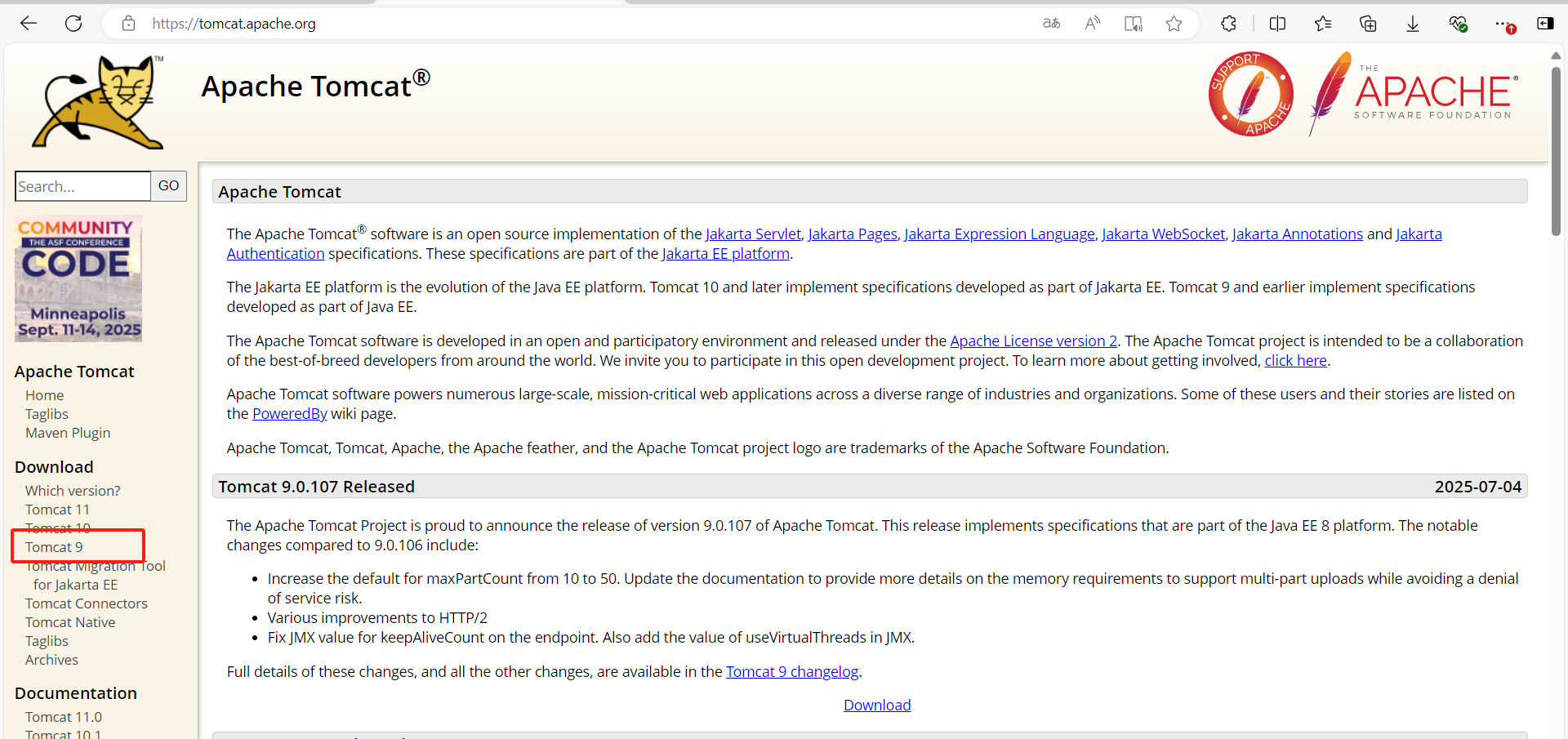 🍕🍕首先访问网址 https://tomcat.apache.org进入到官网,如下图所示
